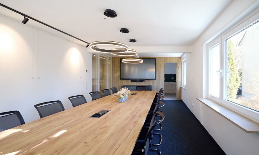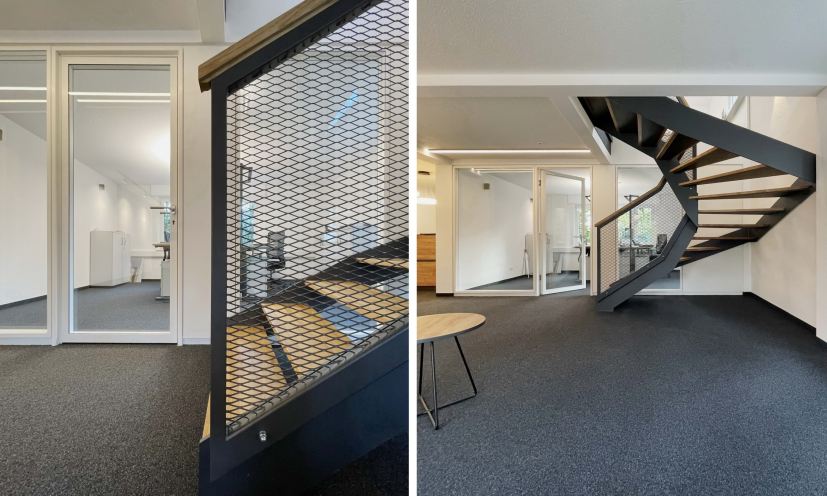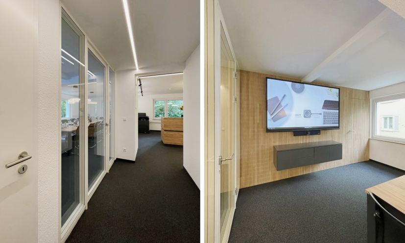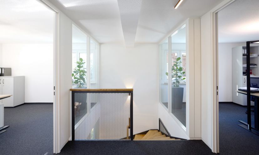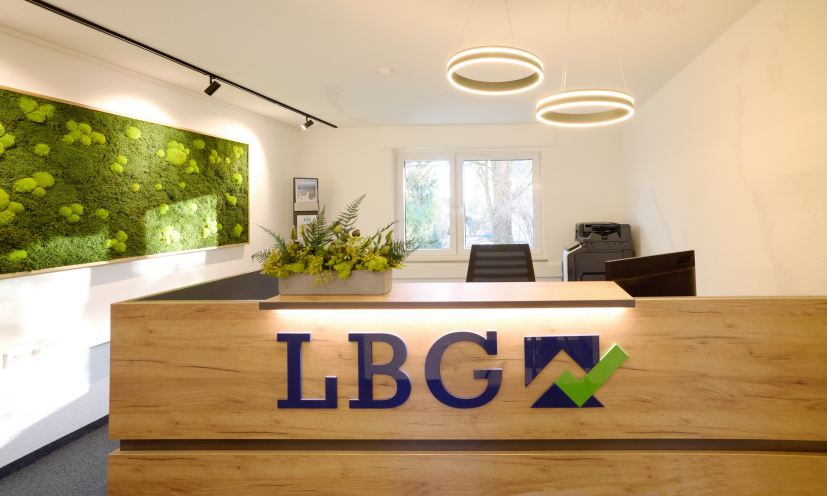 Die Geschäftsstellenräume befanden sich zuvor lediglich im Erdgeschoss, nun können zusätzlich die Räume des Obergeschosses für den Geschäftsstellenbetrieb genutzt werden. Eine neue Stahlwangentreppe mit Holzstufen und Streckmetallfüllung verbindet beide Ebenen miteinander. Das LBG-Team arbeitet in neugestalteten und lichtdurchfluteten Räumen, die nach einem Innenraumkonzept der Architektengruppe KWP umgebaut und modernisiert wurden. Neue Glaswände vermitteln eine großzügige, zeitgemäße und offene Arbeitsatmosphäre. Ein Arrangement aus anthrazitfarbenen Elementen, kombiniert mit Holz und weißen Oberflächen, verleiht der LBG-Geschäftsstelle ein neues Erscheinungsbild. Der umgebaute Konferenzraum wird für zahlreiche Besprechungen, Aufsichtsratssitzung und genossenschaftliche Veranstaltungen genutzt.