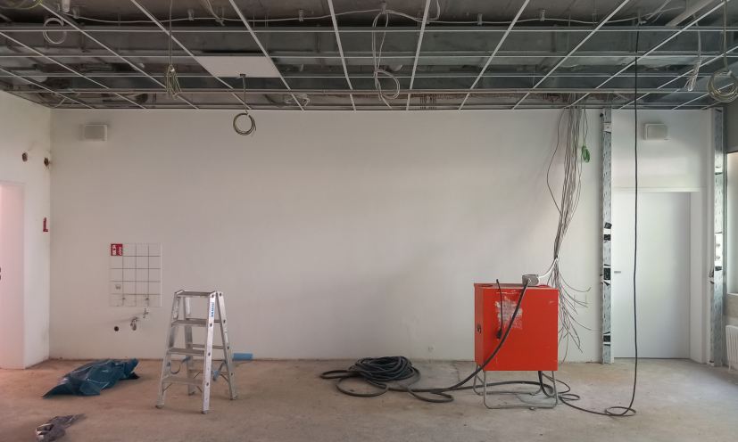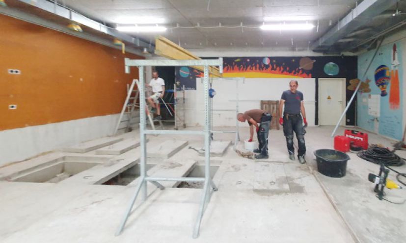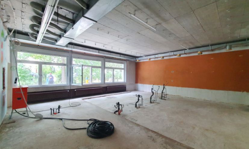 Der bisherige Physikraum entsprach mit seinem auf den Frontalunterricht ausgelegten ansteigenden Gestühl nicht mehr den Anforderungen an heutiges Lernen, daher wurden zunächst die Tisch- und Stuhlreihen mit allen Podesten abgebrochen. Die Türe, die höhenmäßig auf das oberste Podest ausgelegt war, musste inklusive der Stufen im Flur entfernt und durch eine neue, sehr hohe Tür ersetzt werden. Die früher im Unterricht genutzten Gas- und Wasseranschlüsse wurden rückgebaut, hierfür mussten auch die Leitungen im Boden entfernt, die Aussparung verschlossen und der Estrich in dem Bereich angearbeitet werden.