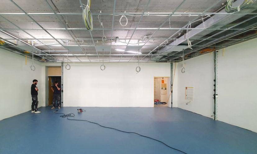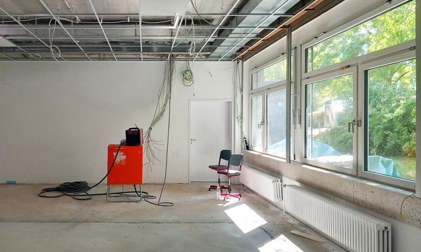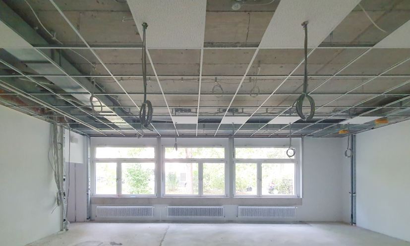 Neue Akustikdecken, in der die Lüftungsleitungen und neuen Stromkabel geführt werden, sowie der neue, blaue R10-Kautschukbodenbelag, verleihen dem Raum ein neues Erscheinungsbild. Die Elektroinstallation wurde inklusive Datennetzwerk vollständig erneuert und auf zeitgemäßen Stand gemäß Schulbaurichtlinien sowie dem digitalen Standard der Landeshauptstadt Stuttgart gebracht. Von der Decke herabhängende Stromwürfel schaffen zusammen mit einer stromsparenden LED-Beleuchtung ein Lernumfeld, das flexibel nutzbar ist. Tische für die Schüler:Innen und Lehrpersonen können entsprechend der Lerninhalte zum Schuljahr 2025/26 nach Bedarf frei im Raum aufgestellt werden.