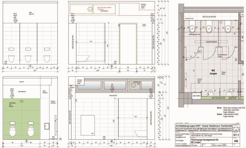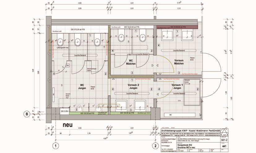 Im Hauptgebäude der Helene-Fernau-Horn-Schule konnten wir für das Schulverwaltungsamt der Landeshauptstadt Stuttgart, vertreten durch das Hochbauamt, die Toilettenanlage für Schülerinnen und Schüler auf Grundlage unserer Beauftragung im Jahreslos planen und die Ausführung der Bauarbeiten in den Sommerferien 2025 begleiten.