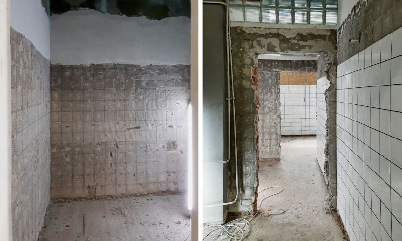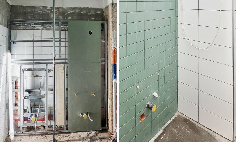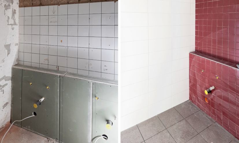 Die vorhandene Sanitäreinrichtung aus den 1970er-Jahren wurde inklusive aller Leitungen vollständig abgebrochen und erneuert. Die neuen beerenrot- und mintgrünfarbenen Fliesen verleihen den neuen Räumen ein zeitgemäßes Umfeld, welches die Schülerinnen und Schüler zum Schuljahr 2025/26 nutzen können.