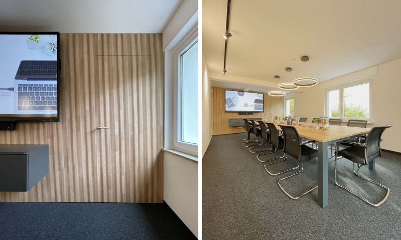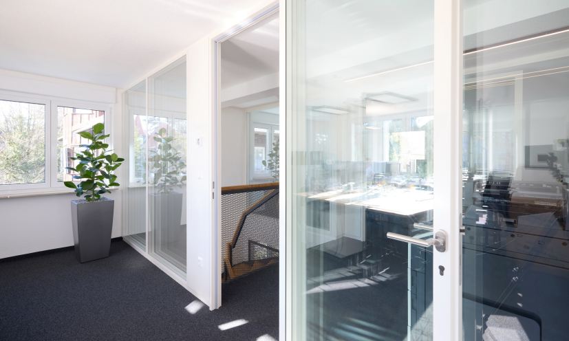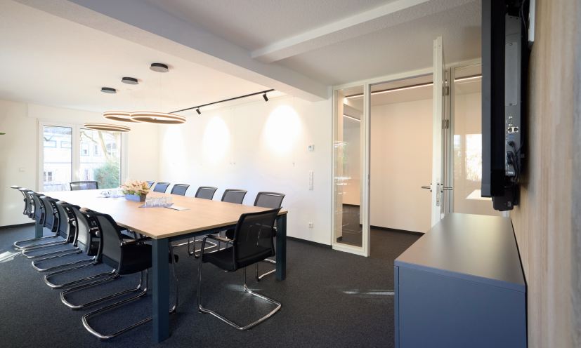 Die Geschäftsstellenräume befanden sich zuvor lediglich im Erdgeschoss, nun können zusätzlich die Räume des Obergeschosses für den Geschäftsstellenbetrieb genutzt werden. Eine neue Stahlwangentreppe mit Holzstufen und Streckmetallfüllung verbindet beide Ebenen miteinander. Das LBG-Team arbeitet in neugestalteten und lichtdurchfluteten Räumen, die nach einem Innenraumkonzept der Architektengruppe KWP umgebaut und modernisiert wurden. Neue Glaswände vermitteln eine großzügige, zeitgemäße und offene Arbeitsatmosphäre. Ein Arrangement aus anthrazitfarbenen Elementen, kombiniert mit Holz und weißen Oberflächen, verleiht der LBG-Geschäftsstelle ein neues Erscheinungsbild. Der umgebaute Konferenzraum wird für zahlreiche Besprechungen, Aufsichtsratssitzung und genossenschaftliche Veranstaltungen genutzt.
