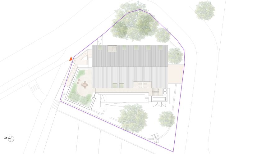 Nach Südwesten öffnet sich ein neuer, räumlich eingefasster Nachbarschaftshof. Das zentral gelegene Freiraumelement schafft eine identitätsstiftende Atmosphäre mit organischer Formgebung, welches zum Spielen, Verweilen, Treffen und gemeinschaftlichem Gärtnern einlädt. Neue Bäume, sowie Hecken- und Staudenpflanzungen, schaffen einen hochwertigen Grünraum. Die Flachdächer über TG und über OG werden extensiv begrünt und beinhalten Regenwasserretentionsflächen. Auf dem Flachdachanbau entsteht, vom Treppenhaus im Dachgeschoss zugänglich, eine Dachterrasse mit Grünpflanzungen für gemeinschaftliche Nutzungen.
