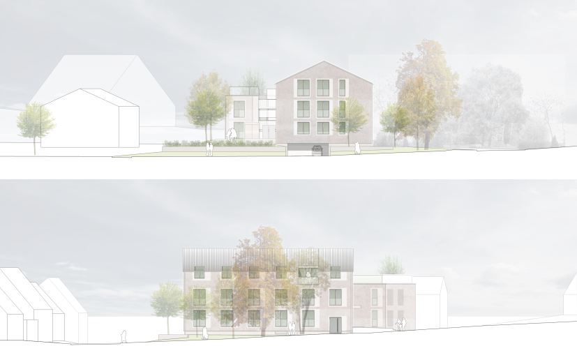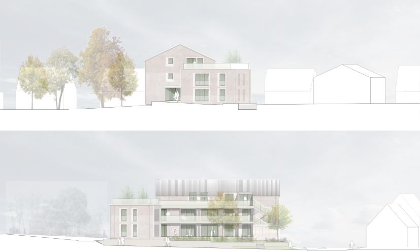 Städtebaulich fügt sich der neue, zweigeschossige Hauptbau als Satteldachzeile in Nord-Südrichtung in die Taktung der benachbarten traufständigen Zeilenbauten ein. Ergänzend ist im Nordwesten ein vorgelagerter, straßengeräuschabschirmender Flachdachbereich angebaut, welcher die Ausbildung einer klaren Adresse an der Straße unterstützt und den Zugangsbereich räumlich einfasst.