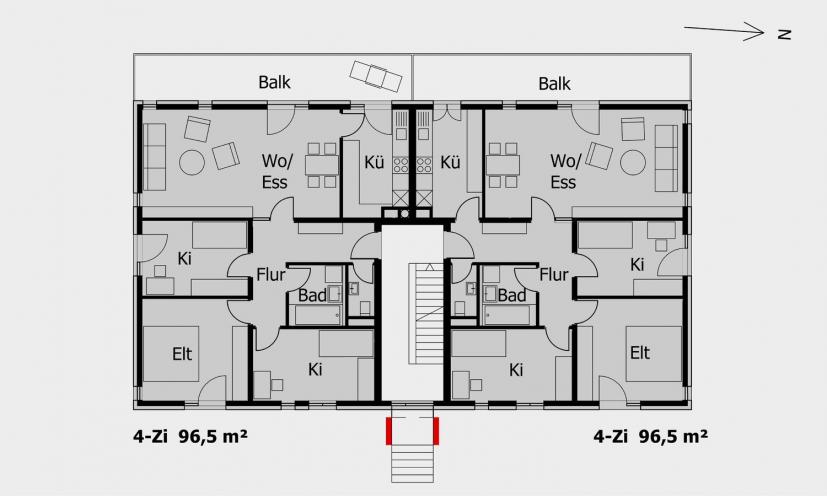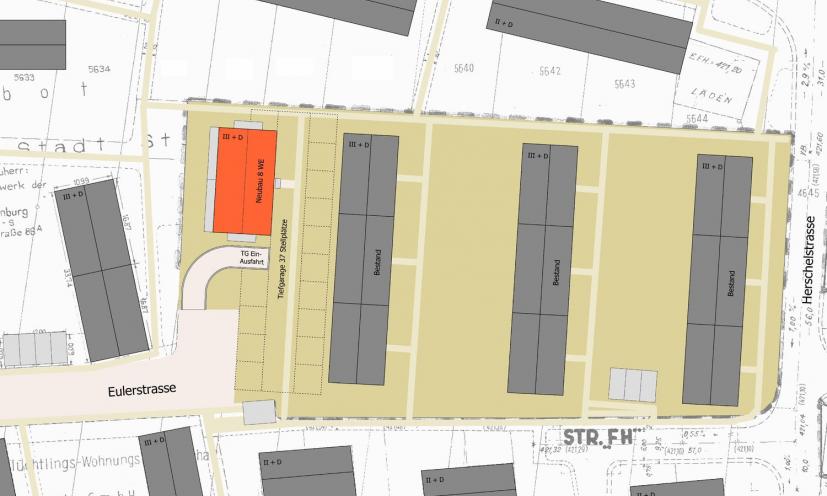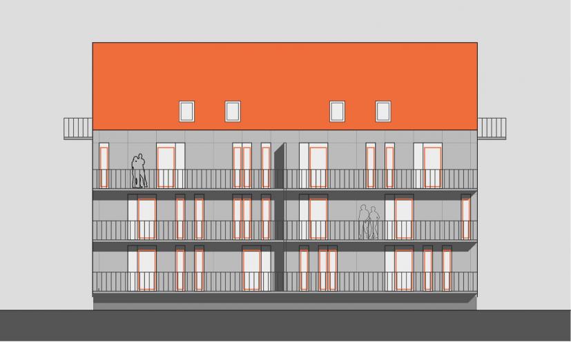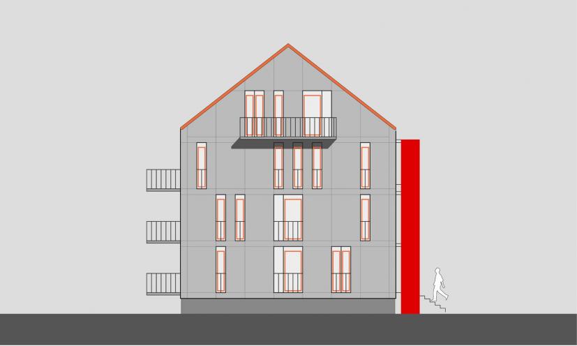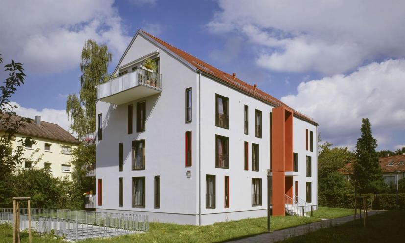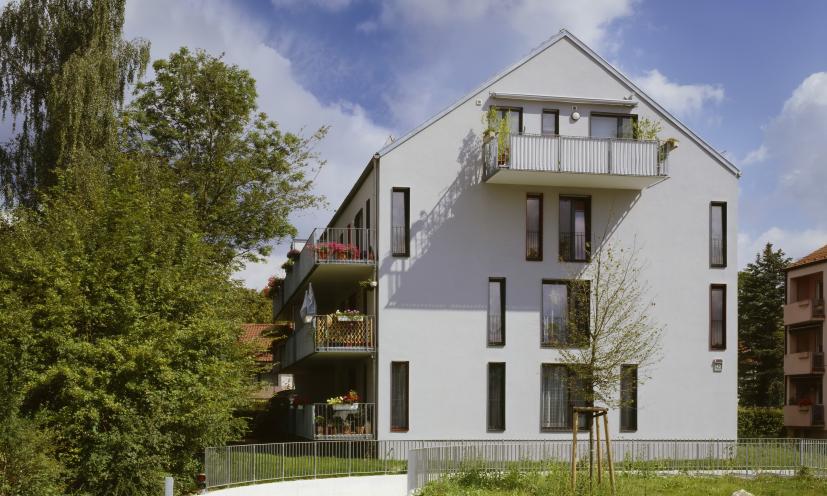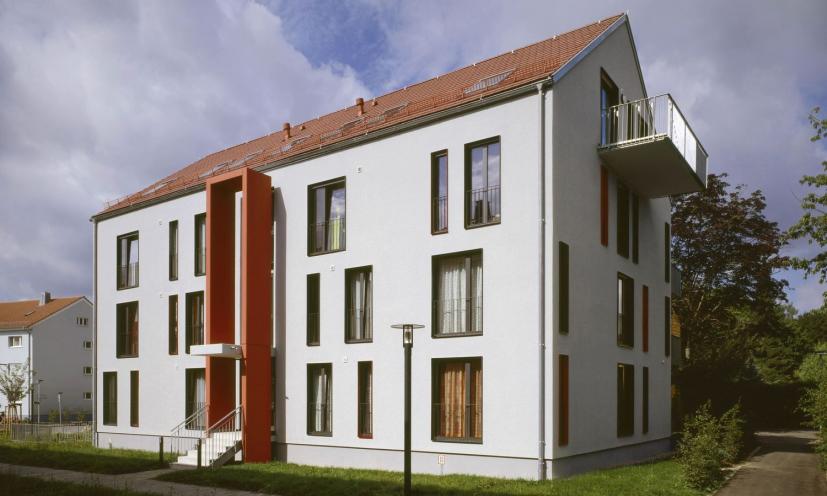 Zur Nachverdichtung und als Ergänzung der drei vorhandenen Gebäudezeilen aus der Nachkriegszeit entstand für die Baugenossenschaft Friedenau eG ein neues Mehrfamilienhaus mit acht genossenschaftlichen Mietwohnungen und 35 TG-Stellplätzen auf bisher unbebauter Fläche. Das dreigeschossige Satteldachhaus fügt sich mit seiner schlichten Bauform und ohne Dachaufbauten in die städtebauliche Struktur der Umgebung ein. Mit versetzt angeordneten, bodentiefen Fensterelementen erhielt das Haus ein zeitgemäßes Erscheinungsbild. Balkone und ein vorgelagertes Eingangsportal ergänzen die kompakte Gebäudeform. Im Gegensatz zu den ausschließlich kleinen Wohnungen im benachbarten Bestand der BG Friedenau wurden im neuen Mehrfamilienhaus hauptsächlich großzügige Vierzimmerwohnungen realisiert.