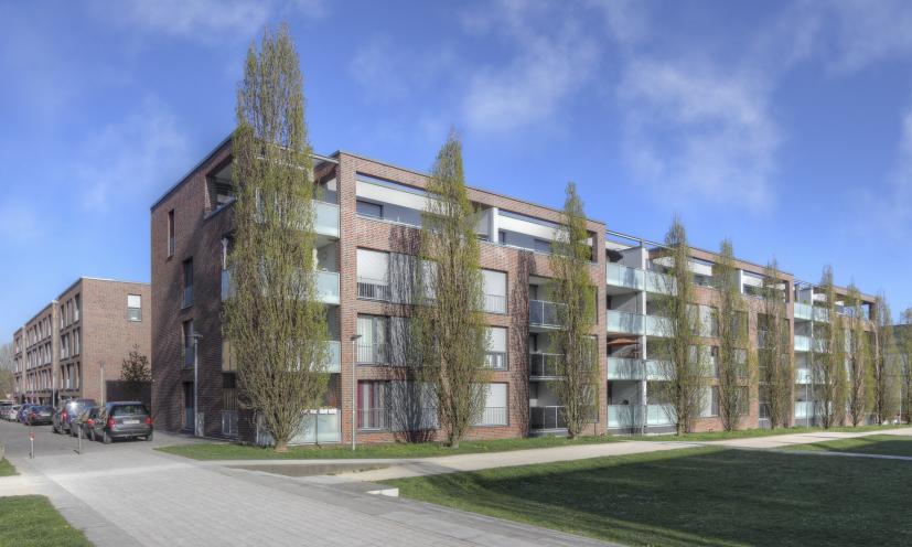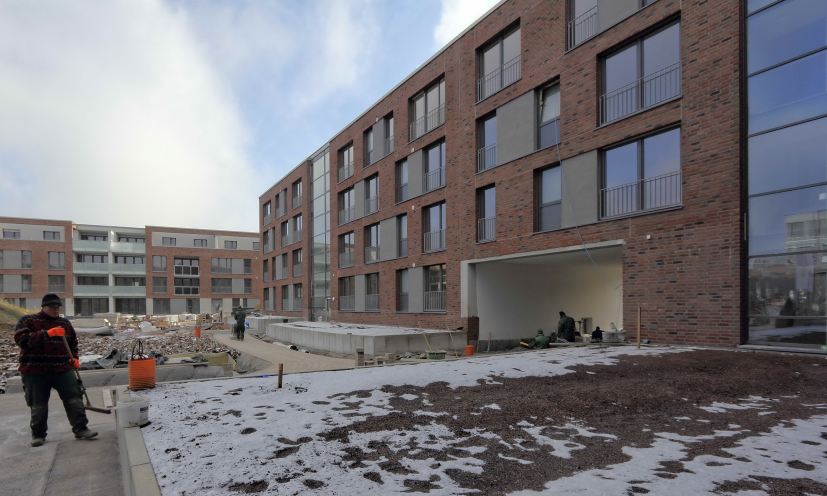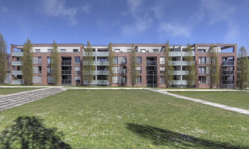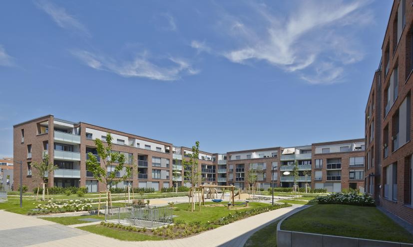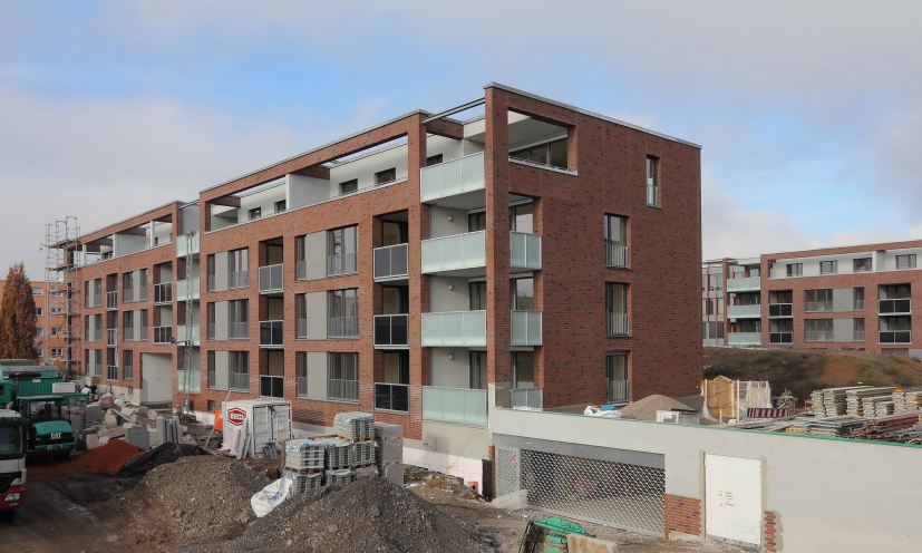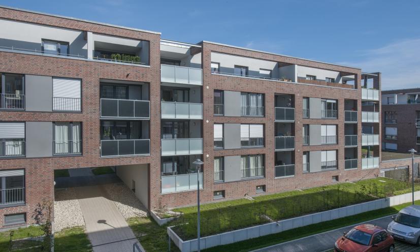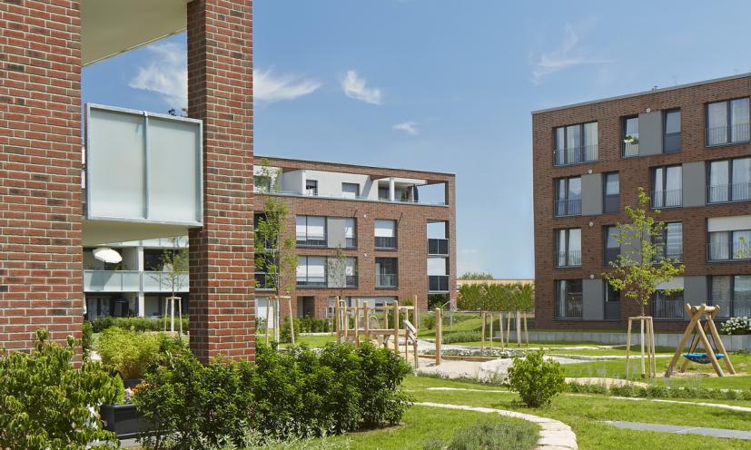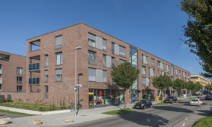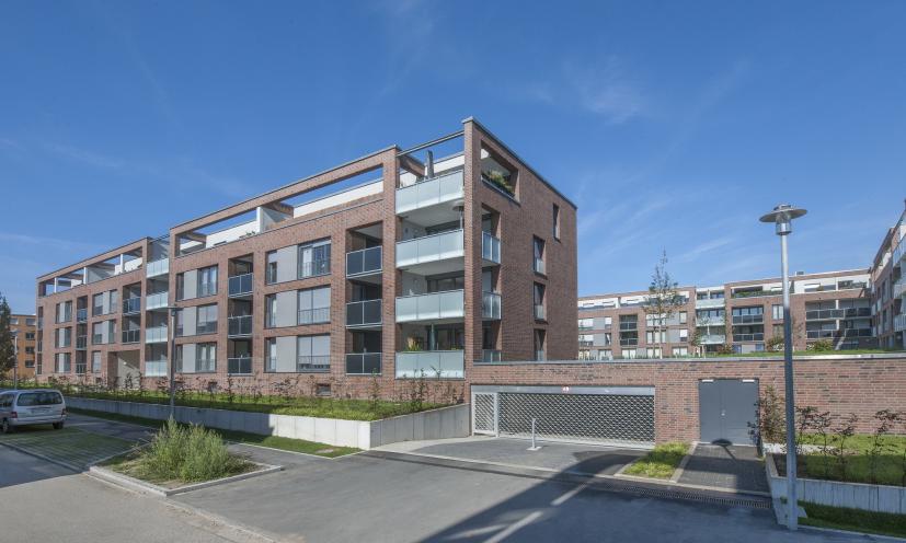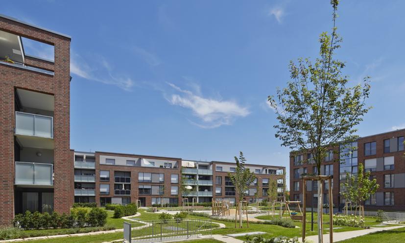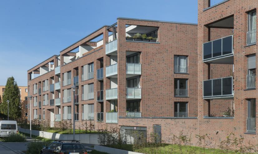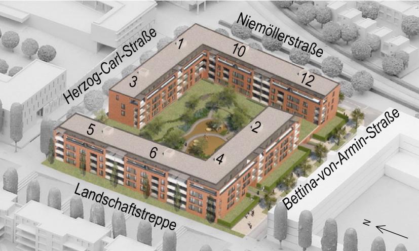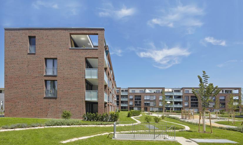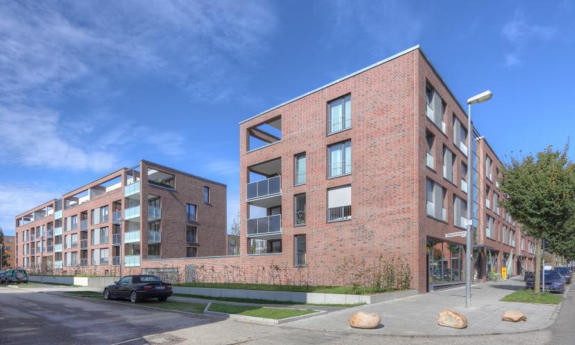 Die viergeschossige Anlage mit Klinkerriemchenfassade wurde in Form einer Blockrandbebauung mit zwei gegenüberliegenden winkelförmig angeordneten Baukörpern konzipiert. Alle 8 Gebäude konnten im Erdgeschoss und den Obergeschossen zugunsten einer kompakten, wirtschaftlichen Bauweise als Drei- und Vierspännertypen realisiert werden. In einer gemeinsamen Tiefgarage sind alle notwendigen PKW-Stellplätze untergebracht.