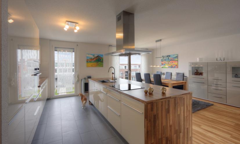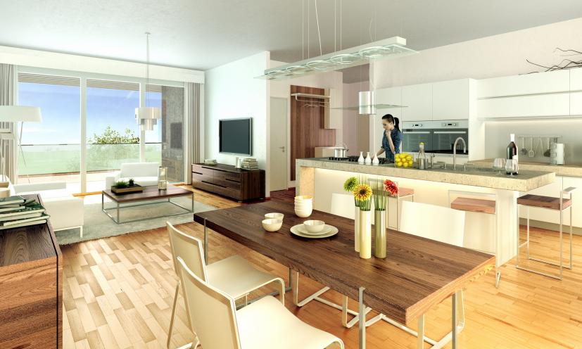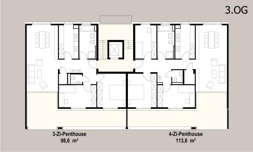 Für die Wohnungen bot es sich an, die Wohnzimmer mit großzügigen Fensterflächen und Balkonen mit Glasbrüstungen hauptsächlich nach Süden und Westen zur „Grünen Mitte“ oder zur „Landschaftstreppe“ zu orientieren. Im obersten Geschoss entstanden Penthouse-Wohnungen mit großzügigen und in Teilbereichen überdachten Terrassen.