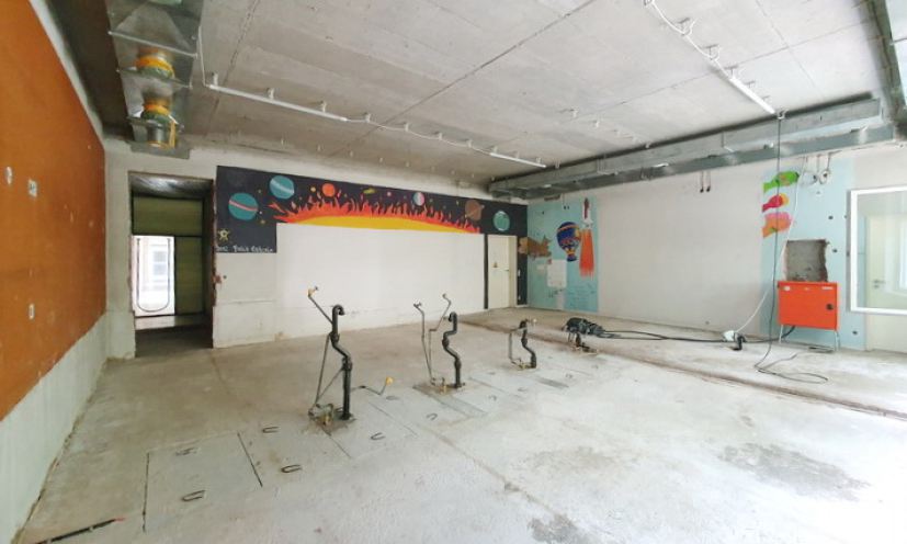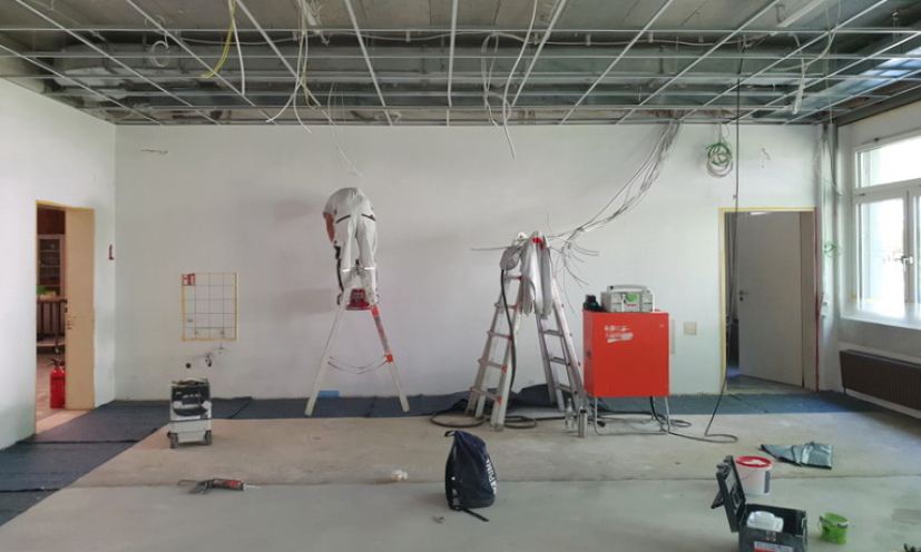 Der bisherige Physikraum entsprach mit seinem auf den Frontalunterricht ausgelegten ansteigenden Gestühl nicht mehr den Anforderungen an heutiges Lernen, daher wurden zunächst die Tisch- und Stuhlreihen mit allen Podesten abgebrochen. Die Türe, die höhenmäßig auf das oberste Podest ausgelegt war, musste inklusive der Stufen im Flur entfernt und durch eine neue, sehr hohe Tür ersetzt werden. Die früher im Unterricht genutzten Gas- und Wasseranschlüsse wurden rückgebaut, hierfür mussten auch die Leitungen im Boden entfernt, die Aussparung verschlossen und der Estrich in dem Bereich angearbeitet werden.