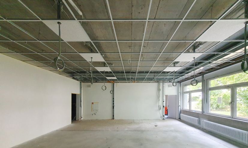 Neue Akustikdecken, in der die Lüftungsleitungen und neuen Stromkabel geführt werden, sowie der neue, blaue R10-Kautschukbodenbelag, verleihen dem Raum ein neues Erscheinungsbild. Die Elektroinstallation wurde inklusive Datennetzwerk vollständig erneuert und auf zeitgemäßen Stand gemäß Schulbaurichtlinien sowie dem digitalen Standard der Landeshauptstadt Stuttgart gebracht. Von der Decke herabhängende Stromwürfel schaffen zusammen mit einer stromsparenden LED-Beleuchtung ein Lernumfeld, das flexibel nutzbar ist. Tische für die Schüler:Innen und Lehrpersonen können entsprechend der Lerninhalte zum Schuljahr 2025/26 nach Bedarf frei im Raum aufgestellt werden.