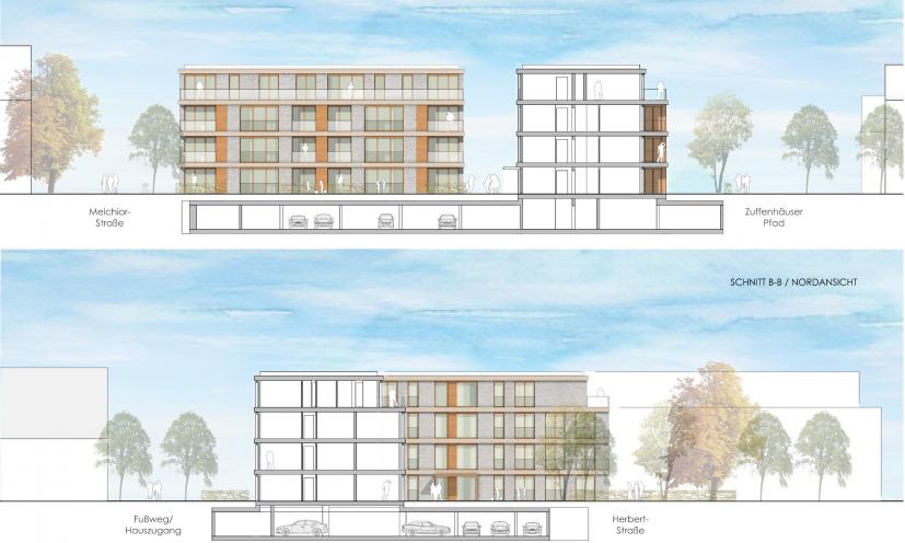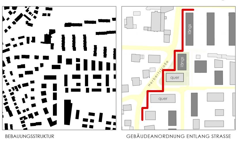 Unter Berücksichtigung des städtebaulichen Umfeldes sieht unser Konzept zwei kompakte, viergeschossige Baukörper vor, die innerhalb des Baufensters orthogonal zueinander angeordnet den adressbildenden Auftakt des Neubaugebiets darstellen. Die Abfolge der Nachbargebäude, die quer- und längs zur Herbertstraße angeordnet sind, wird mit den beiden Neubauten sinnvoll ergänzt.
