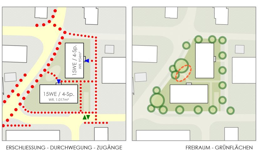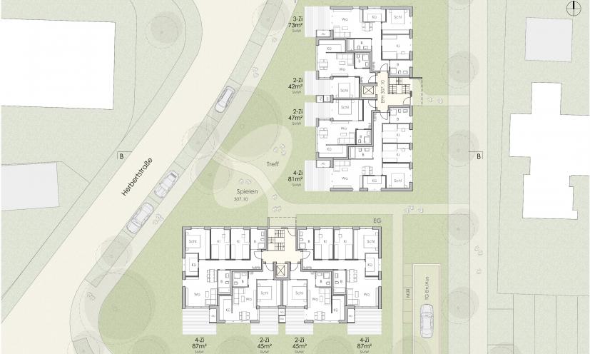 Beide Wohnhäuser sind als Vierspänner-Typen mit kompakten Grundrissen konzipiert.