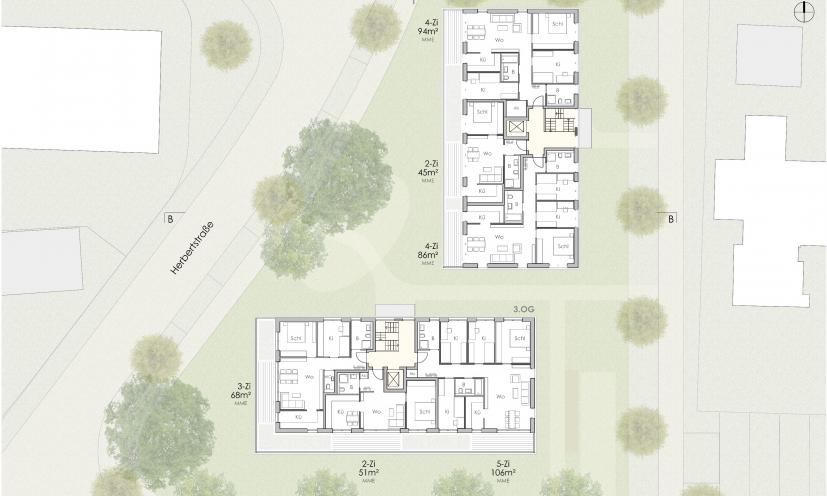 Innerhalb der Gebäuderücksprünge entlang der Herbertstraße sind vier neue Bäume vorgesehen, welche zusammen mit der städtischen straßenbegleitenden Pflanzung Baumgruppen bilden. Im Süden sind straßenbegleitende Bäume geplant.