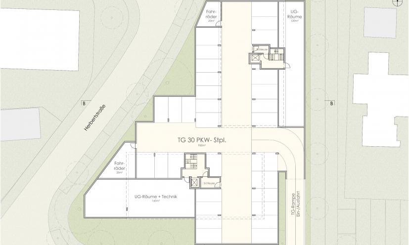 Die Flächen für den ruhenden Verkehr (Tiefgarage), Technik, Nebenräume und Fahrradstellflächen sind im Untergeschoss nach wirtschaftlichen Gesichtspunkten untergebracht.