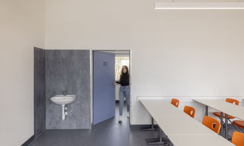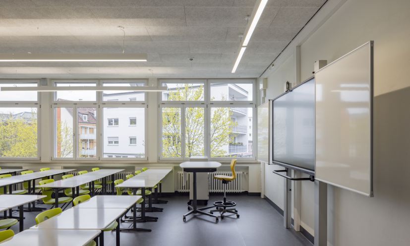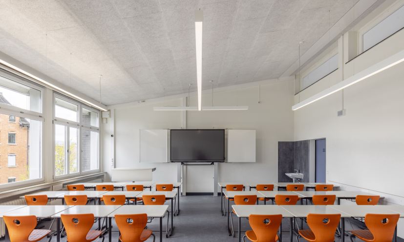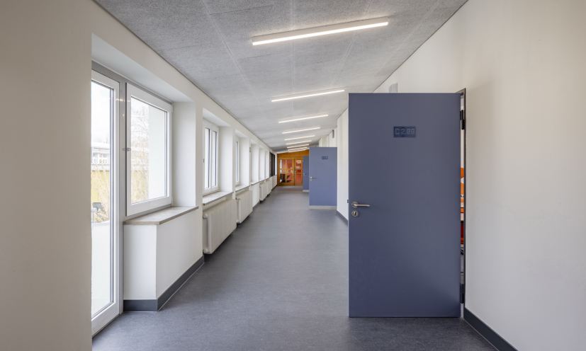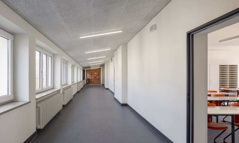Alle Klassen- und Fachräume sowie die Erschließungsbereiche erhielten weiterhin neue Akustikdecken und Linoleum-Bodenbeläge. Im Erdgeschossflur wurde der vorhandene Betonwerksteinbelag erhalten, rutschhemmend abgeschliffen und neu versiegelt.