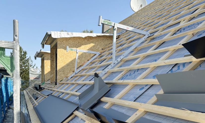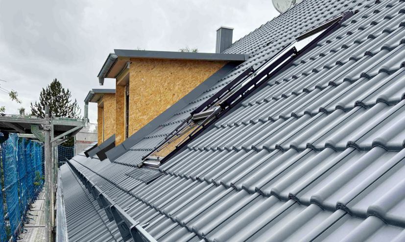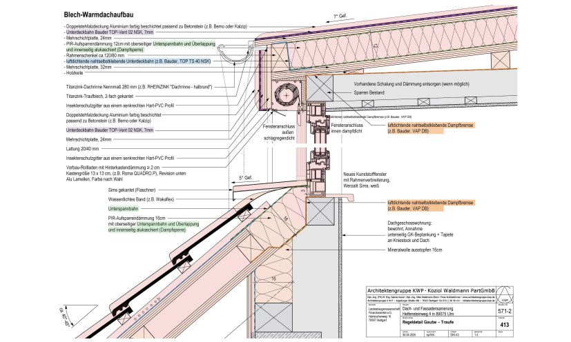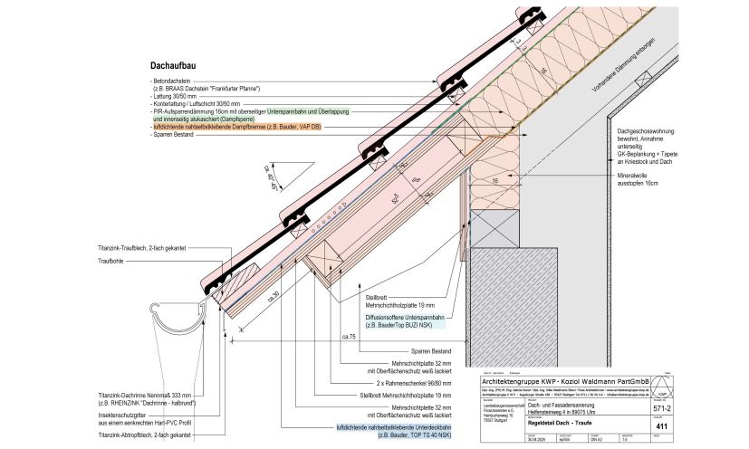 Das Dach erhielt eine Aufsparrendämmung, zudem wurden die Dachvorsprünge vergrößert, um die Fassade zu schützen und eine spätere Nachrüstung einer Fassadendämmung zu ermöglichen.