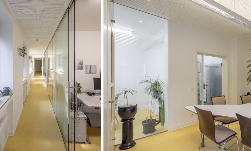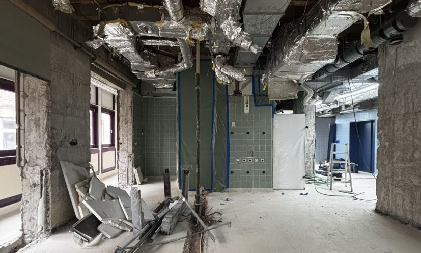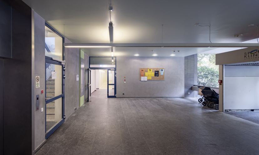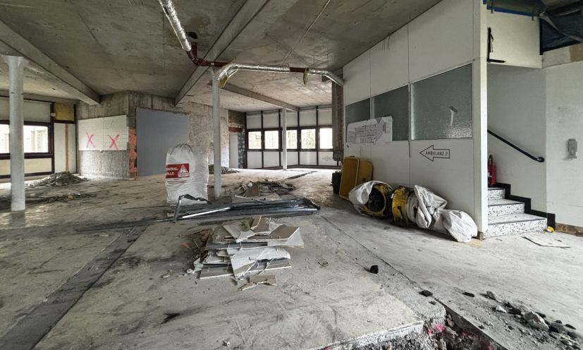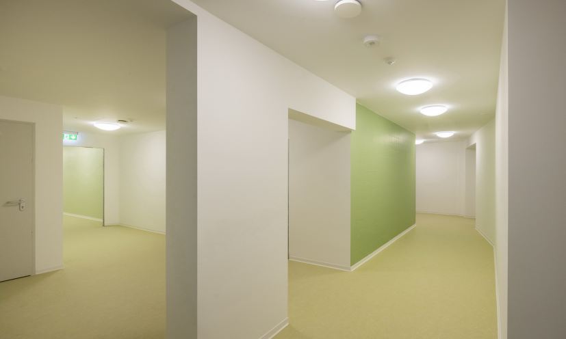 Baubegleitend wurde die Planung ausgearbeitet und die Vergabe für die weiteren Bauabschnitte im EG und 4.OG vorbereitet. Mit einfachen Umbaumaßnahmen wurden die bisherigen Behandlungszimmer in Büroräume umgenutzt. Deutlich aufwändiger war das vollständige Entkernen der ehemaligen Operationssääle und Röntgenräume mit Rück- bzw. Umbau der umfangreichen Technik, bevor hier neuer Wohnraum entstehen konnte. Teilweise erhielt die neue Nutzung eine zweite Fassade innerhalb der vorhandenen Gebäudestruktur. Es entstand eine Unterkunft mit Zimmern, Sanitärräumen und Küchen sowie eine Spielstube für Kinder, die optimal in den Bestand integriert wurde. Wo es möglich war, wurde der Bestand erhalten, beispielsweise erinnern geflieste Wände mit neuer Farbgebung noch an die frühere OP-Nutzung. Nach weiteren neun Monaten Bauzeit wurden alle Räume der Bauabschnitte zwei bis vier übergeben und belegt.