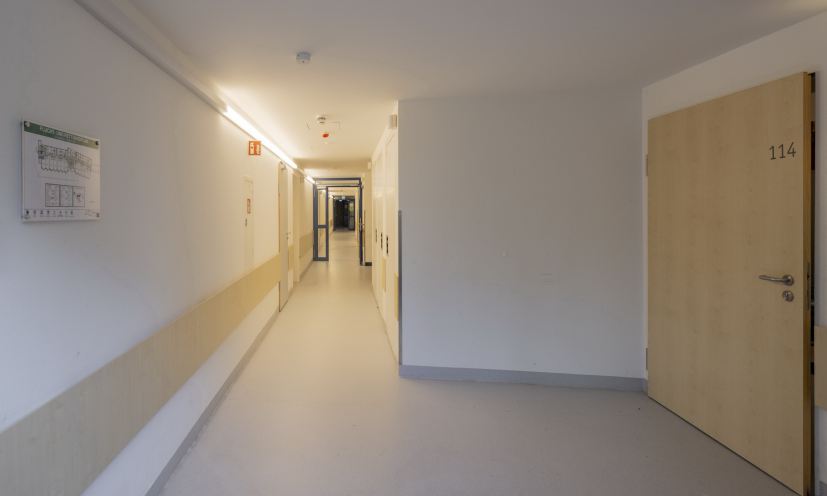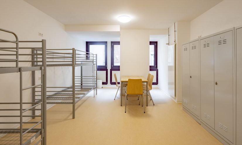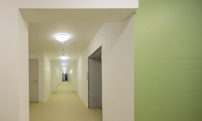 Eine Herausforderung war der enge zeitliche Rahmen, in dem die Umbaumaßnahmen in dem von 1967 bis 1973 errichteten fünfgeschossigen Bestandsgebäudes umgesetzt werden mussten. Zunächst konnten im ersten Bauabschnitt die vorhandenen Patientenzimmer im 1. - 3.OG umgenutzt werden, da es mit geringem Aufwand möglich war, da die vorhandenen Zimmer mit Sanitärräumen weitestgehend zu übernehmen. Neue Küchen, zusätzliche Sanitärräume, Gemeinschaftsräume und ein Waschraum wurden ergänzt, sodass nach vier Monaten Bauzeit gemäß Beschluss der "Task Force Flüchtlinge" bereits eine Erstbelegung mit 136 Personen möglich wurde.