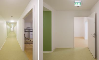 Eine Herausforderung war der enge zeitliche Rahmen, in dem die Umbaumaßnahmen in dem von 1967 bis 1973 errichteten fünfgeschossigen Bestandsgebäudes umgesetzt werden mussten. Zunächst konnten im ersten Bauabschnitt die vorhandenen Patientenzimmer im 1. - 3.OG umgenutzt werden, da es mit geringem Aufwand möglich war, da die vorhandenen Zimmer mit Sanitärräumen weitestgehend zu übernehmen. Neue Küchen, zusätzliche Sanitärräume, Gemeinschaftsräume und ein Waschraum wurden ergänzt, sodass nach vier Monaten Bauzeit gemäß Beschluss der "Task Force Flüchtlinge" bereits eine Erstbelegung mit 136 Personen möglich wurde.