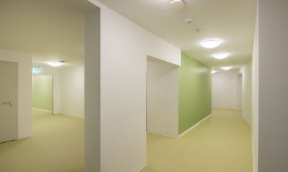 Baubegleitend wurde die Planung ausgearbeitet und die Vergabe für die weiteren Bauabschnitte im EG und 4.OG vorbereitet. Mit einfachen Umbaumaßnahmen wurden die bisherigen Behandlungszimmer in Büroräume umgenutzt. Deutlich aufwändiger war das vollständige Entkernen der ehemaligen Operationssääle und Röntgenräume mit Rück- bzw. Umbau der umfangreichen Technik, bevor hier neuer Wohnraum entstehen konnte. Teilweise erhielt die neue Nutzung eine zweite Fassade innerhalb der vorhandenen Gebäudestruktur. Es entstand eine Unterkunft mit Zimmern, Sanitärräumen und Küchen sowie eine Spielstube für Kinder, die optimal in den Bestand integriert wurde. Wo es möglich war, wurde der Bestand erhalten, beispielsweise erinnern geflieste Wände mit neuer Farbgebung noch an die frühere OP-Nutzung.