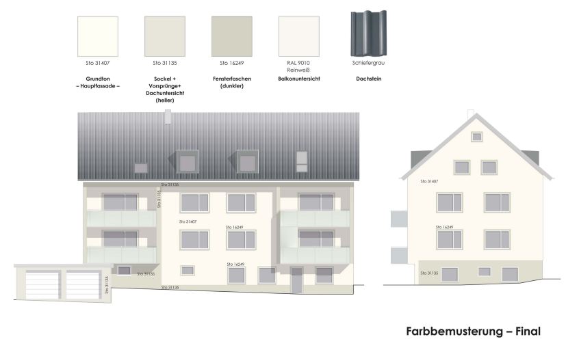 Neue Kunststofffenster wurden bereits vor wenigen Jahren eingebaut. Der gut erhaltene Außenputz erhielt als Instandhaltungsmaßnahme einen neuen Anstrich gemäß Farbkonzept.