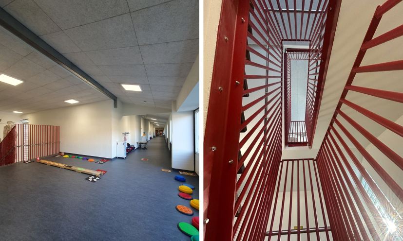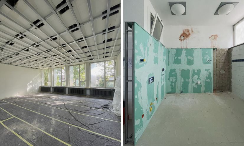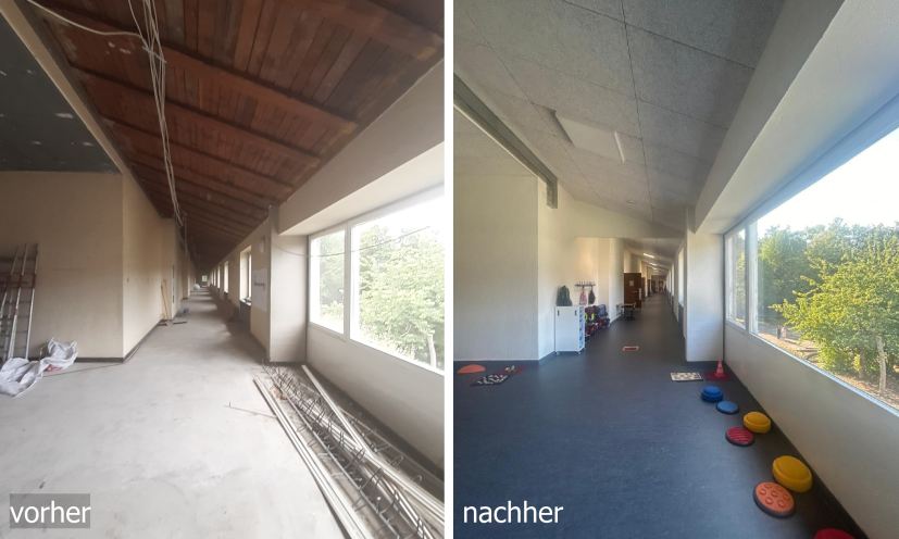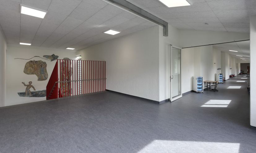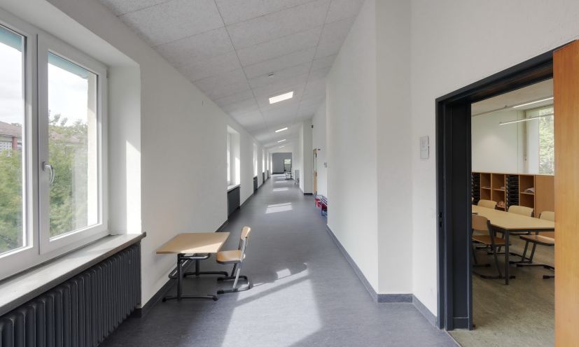 Im gesamten Ostflügel der Schulanlage wurde der Innenausbau mit Akustikdecken sowie neuen Boden- und Wandbelägen, Elektroinstallationen inklusive Datennetzwerk und LED-Beleuchtung auf zeitgemäßen Stand gebracht und brandschutztechnisch ertüchtigt.
