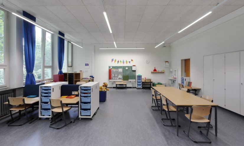 Neben zehn zeitgemäßen Klassenzimmern entstanden nach der Sanierung Räume zum Toben oder zum Entspannen sowie für die Essensausgabe. In beiden Sanitärbereichen wurden Pflegebäder eingebaut. Die Treppenhäuser wurden mit neuer, höherer Absturzsicherung zusätzlich gesichert. Die vorhandenen Betonwerksteinbeläge wurden rutschhemmend abgeschliffen und neu versiegelt.